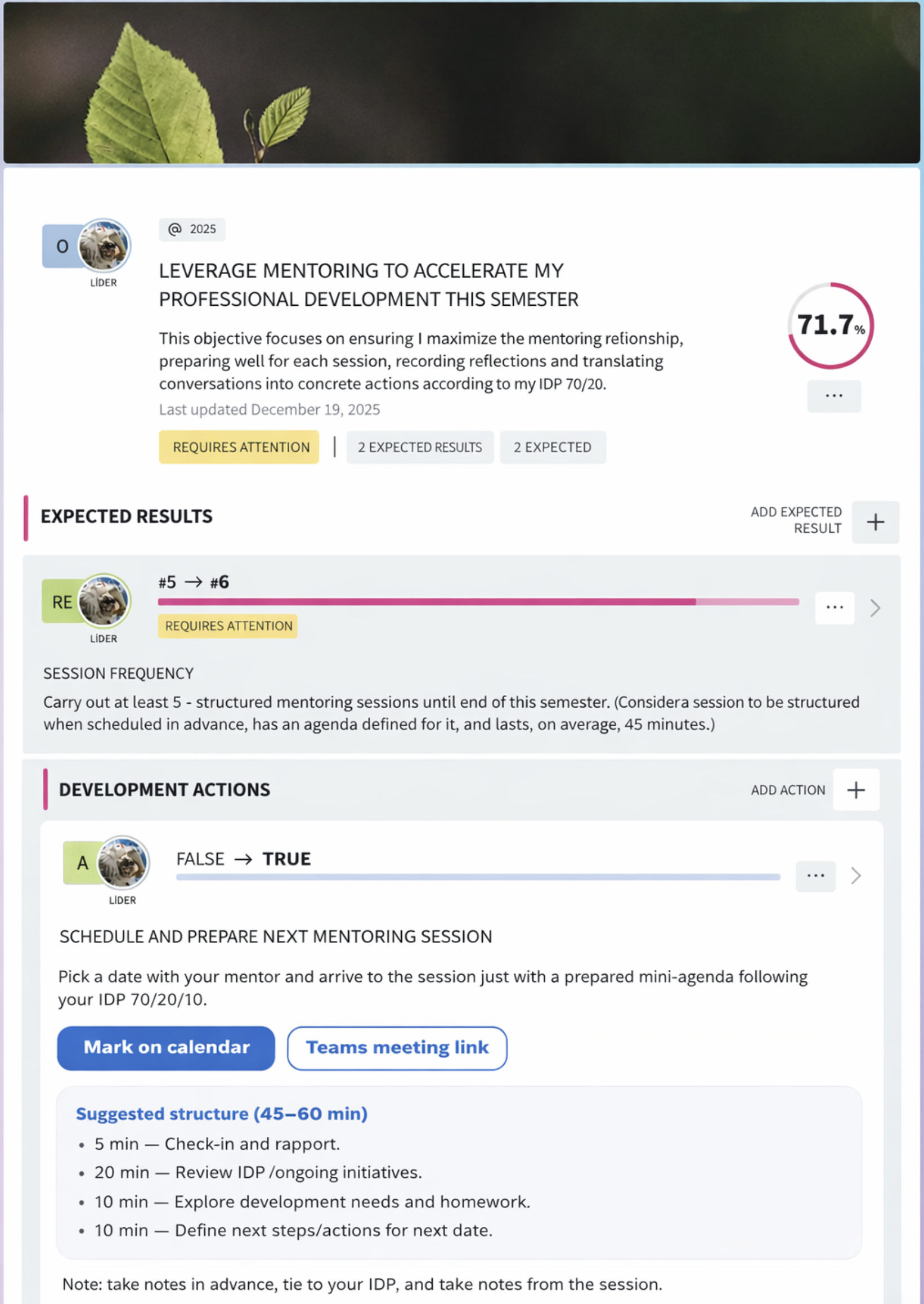 - Career Connection: Goals defined in mentoring feed directly into Career Plans and Performance Reviews.
